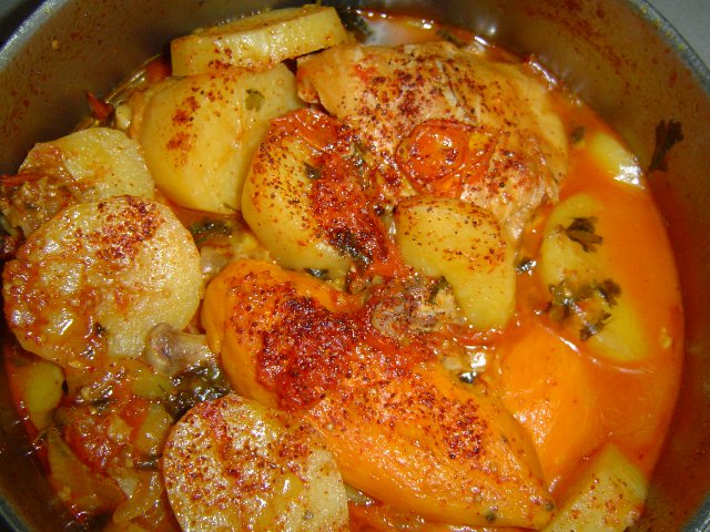 בשלב הוספת התפו"א הם לא כולם היו מכוסים במיים אז הוספתי מים כך שכמעט יכסו אותם ואת העוף מעל.