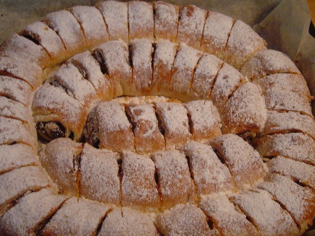 מחצית הבצק במילוי בממרח שוקולד רוזמרי וגלגלתי לזר (בתבנית עגולה קטנה), ומחצית בממרח קינמון אותם עשיתי לגלילים.